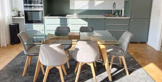 L'espace de vie, élégant et chaleureux, est conçu pour offrir une sensation de volume et de clarté. La cuisine ouverte s'intègre parfaitement à l'ensemble, offrant modernité et convivialité. La salle de bain, équipée d'une baignoire, est complétée par des WC séparés et un espace buanderie, ajoutant un véritable confort au quotidien.