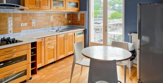 Le logement se compose d' une belle entrée pouvant accueillir un espace bureau, un vaste séjour en parquet ouvrant sur un balcon, et d'une cuisine équipée jouxtant la pièce de vie. Cette dernière bénéficie également d'un espace extérieur permettant de profiter de la vue sur la colline et de l'ensoleillement.