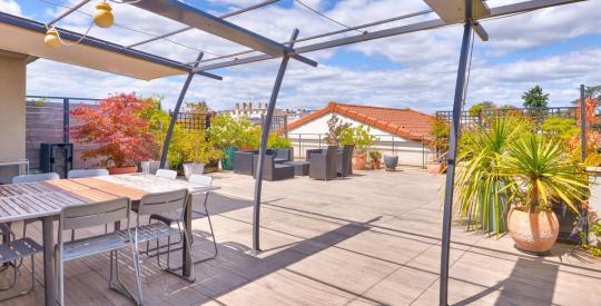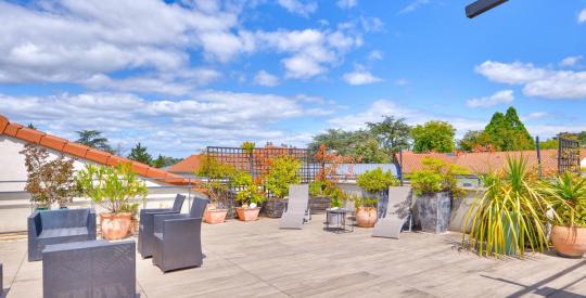 Idéalement situé dans l'hypercentre de Tassin, proche de toutes commodités, commerces, arrêts de bus, dans une copropriété à faibles charges très recherchée de 2008 avec parc arboré et piscine, découvrez cet appartement en toit terrasse 6 pièces 4 chambres de 122m2 de surface habitable avec une terrasse de 125m2 ainsi qu'un grand garage double.