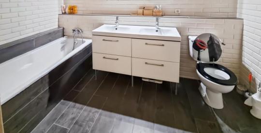 Un élégant escalier en pin mène au niveau inférieur où se dévoilent une grande salle de bain au style affirmé avec un second WC, deux chambres donnant sur la cour intérieure, ainsi qu'une véritable buanderie, spacieuse et fonctionnelle. De nombreux rangements complètent l'ensemble.