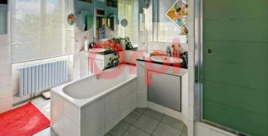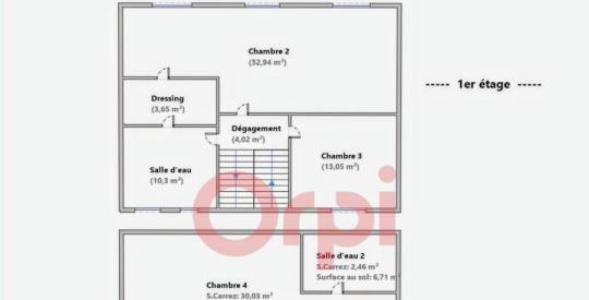 L'étage est actuellement composé de deux chambres, un dressing, une salle de bain avec baignoire, douche et wc. Une des deux chambres est assez grande (33m²) pour permettre de créer une chambre supplémentaire.