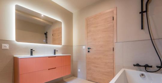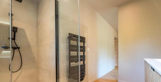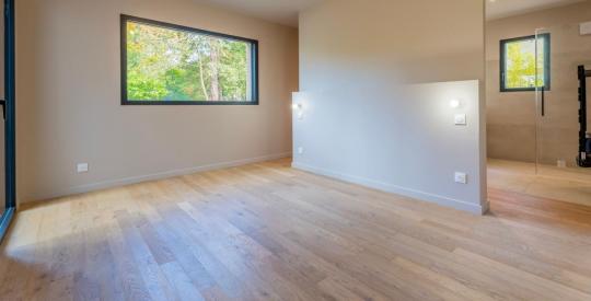 En RDC se trouve une entrée, une spacieuse et lumineuse pièce de vie de 58m2 orientée est-ouest avec une buanderie, une suite parentale comprenant une salle d'eau à l'italienne et un dressing, des toilettes.