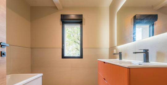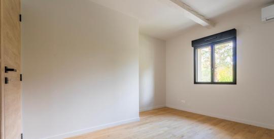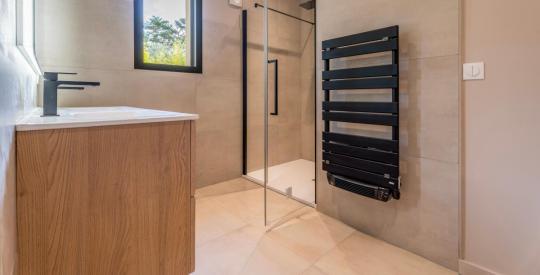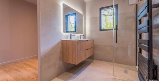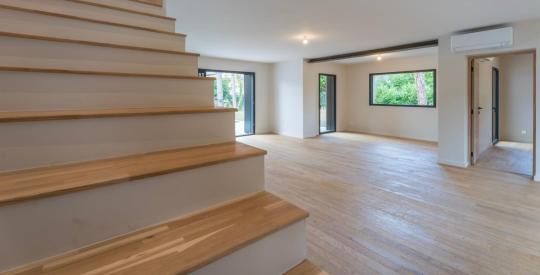 En RDC se trouve une entrée, une spacieuse et lumineuse pièce de vie de 58m2 orientée est-ouest avec une suite parentale comprenant une salle d'eau à l'italienne et un dressing, des toilettes et une buanderie