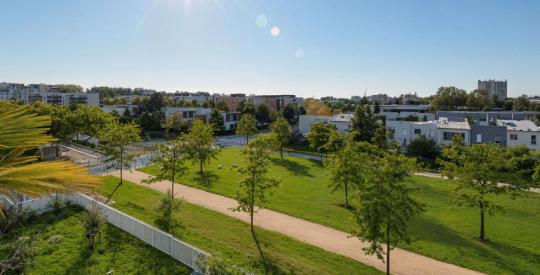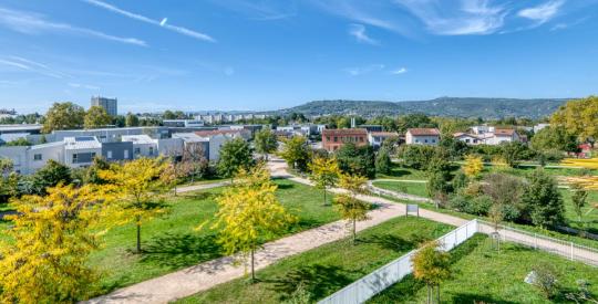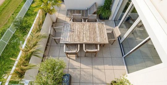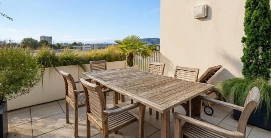 Sa terrasse de 62 m² aménagée, orientée sud-est et sud-ouest, domine la vallée de la Saône, l'arboretum de Sathonay et son parc, offrant un panorama d'une beauté saisissante, véritable prolongement naturel de l'appartement.