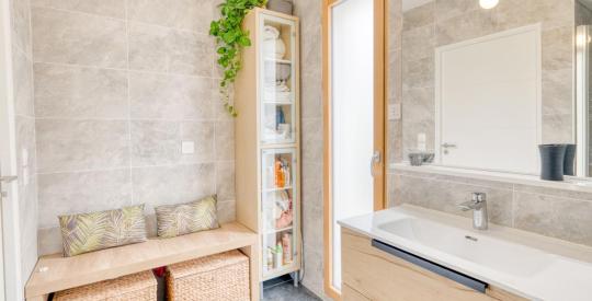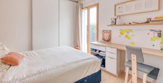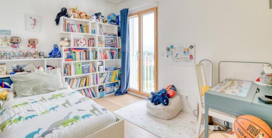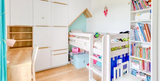 L'étage supérieur accueille trois chambres spacieuses, chacune avec rangements sur mesure et pensées pour offrir un véritable confort quotidien. Une salle de jeux pour enfant peut aussi être transformée en espace nuit invité. Une salle de bain de belle facture, et un second WC viennent parfaire ce niveau.