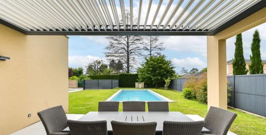 Elle est composée au 1er niveau d'une vaste cuisine et séjour ouvrant sur une terrasse et un jardin au Sud avec une piscine 4mx10m sécurisée et chauffée.