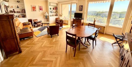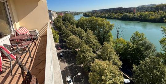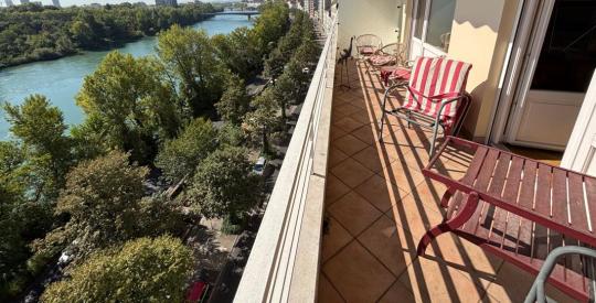 EXCLUSIVITE CALUIRE ,très bel immeuble PITANCE cours Aristide Briand , T4 traversant EST/ ouest de 120 M² avec grand balcon au 7 ème étage , avec vue à couper le souffle des 2 côtés sans vis à vis. Appartement entièrement rénové, avec très belle pièce de vie en parquet, donnant sur un grand balcon avec vue sur le Rhône et le Parc de la tête D or, 3 grandes chambres en parquet, cuisine équipée avec petit balcon pour prendre son déjeuner donnant sur les magnifiques jardins. Salle de bains , une salle d eau et wc séparé. Appartement climatisé, fenêtres doubles vitrages.