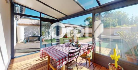 Véritable signature du bien : la véranda s'ouvre largement pour devenir une extension naturelle de l'espace de vie, en lien direct avec la terrasse et la piscine.
