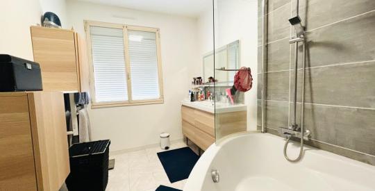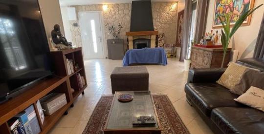 sur le séjour/salon avec cheminée, deux belles chambres dont une avec dressing, les deux avec une toile décorative avec isolation phonique et thermique, une vaste salle de bains avec baignoire d'angle et fenêtre, WC avec mains, fenêtre.