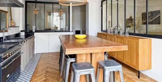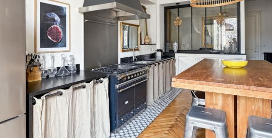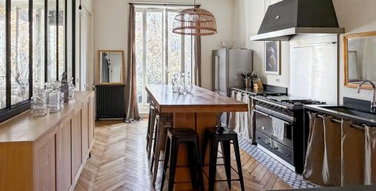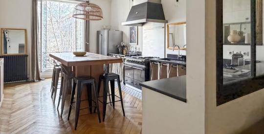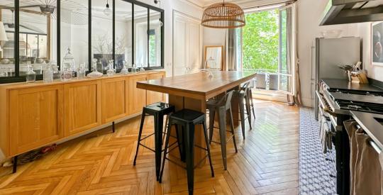 Côté Est, sur l'avenue Maréchal de Saxe, se trouvent une vaste cuisine dinatoire équipée dont un piano de cuisson Lacanche. Une verrière permet la vue sur le salon de 38,45m².