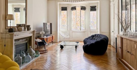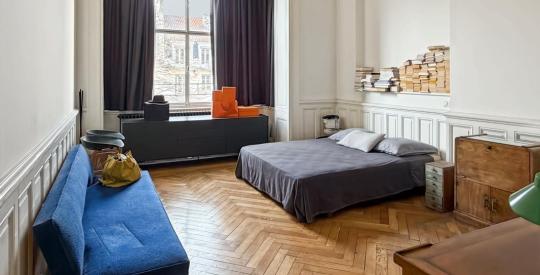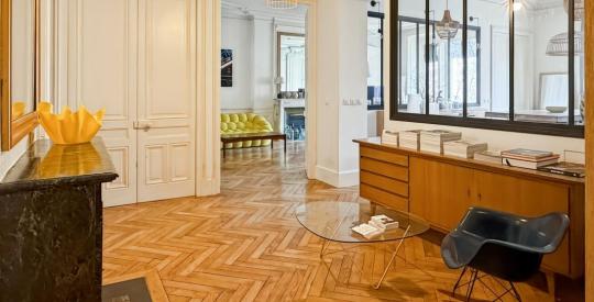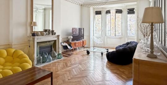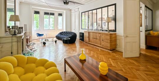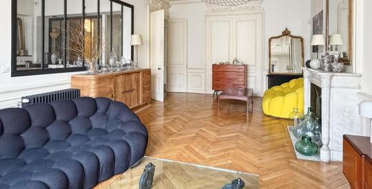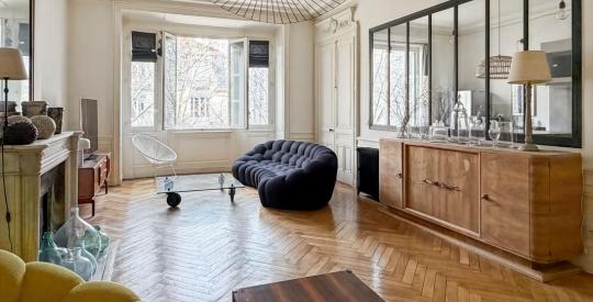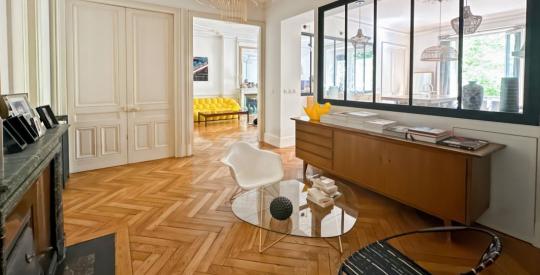 Situé à l'avant-dernier étage, desservi par un ascenseur, ce bien traversant de 145.10m² a été entièrement repensé par un architecte en 2012. Il marie avec élégance le charme de l'ancien, hauteur sous plafond, moulures, cheminées, à un agencement contemporain.