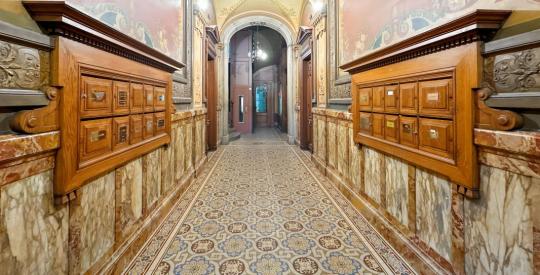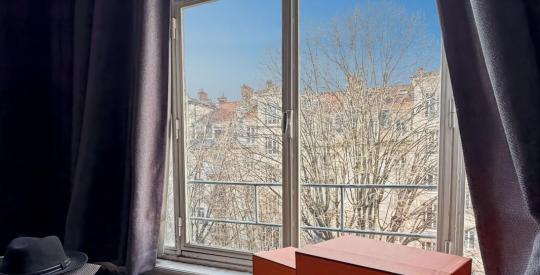 Il se niche dans un remarquable immeuble Haussmannien de 1903, signé par l'architecte E. Curny et édifié sur son terrain. Les parties communes, typiques du quartier avec un patrimoine architectural préservé dont vitraux floraux, murs peints et ferronneries d'époque.