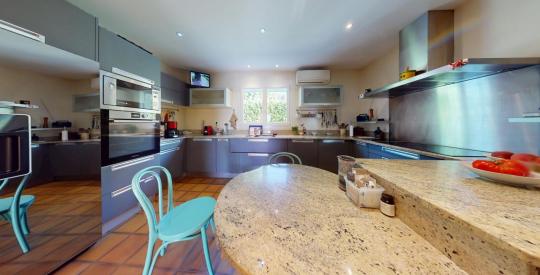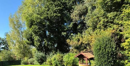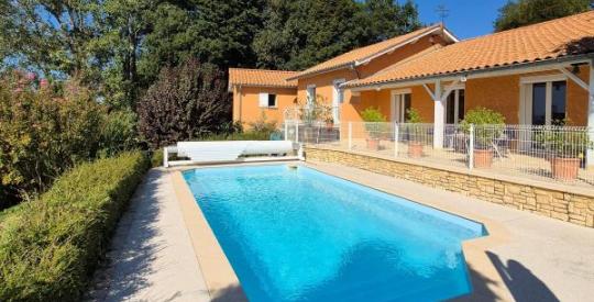 Elle est édifiée sur un très beau terrain paysagé clos et arboré avec piscine