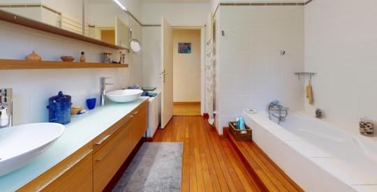 quelques marches vous conduisent à l'espace nuit doté de 3 belles chambres ,1 grande salle de bains avec douche et baignoire, un bureau et une suite parentale avec salle d'eau et dressing. En rdj, vous disposerez d'une buanderie, de rangements, d'un studio indépendant avec kitchenette, salle d'eau ,salon et chambre, pouvant générer un revenu locatif.
