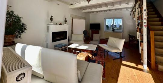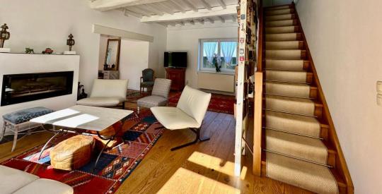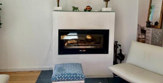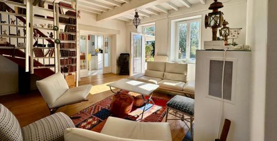 Le salon est une invitation au repos. La cheminée, véritable pièce maîtresse, rappelle les origines de la ferme et promet des soirées d'hiver inoubliables. C'est un espace où le volume permet toutes les configurations de mobilier. Ici, le charme des volumes anciens se marie à une sécurité moderne : toutes les fenêtres du rez-de-chaussée sont équipées de verres de sécurité (anti-effraction) et de volets roulants électriques en aluminium, garantissant une isolation phonique et thermique optimale.