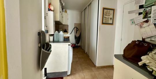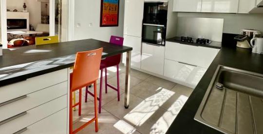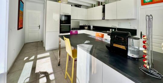 La cuisine, cœur fonctionnel de la maison, a bénéficié d'un agrandissement récent et audacieux. Entièrement équipée, elle s'ouvre sur les espaces de vie et la terrasse. Un agrandissement a été réalisé avec une isolation de pointe, garantissant une continuité parfaite du confort thermique. À proximité immédiate, un bureau et une buanderie parfaitement organisées facilitent le quotidien.