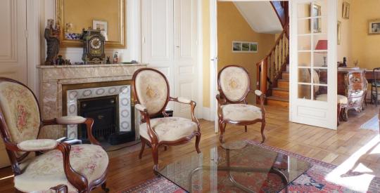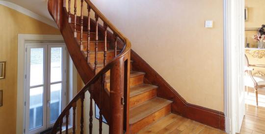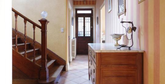 Des cheminées décoratives, un bel escalier en chêne et des parquets chevrons viennent parfaire le charme de cette maison.