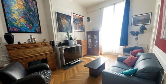 Cet appartement traversant Est/Ouest de 90,13 m² séduit par son charme authentique : parquet en chevrons, cheminées , belle hauteur sous plafond et moulures élégantes.
