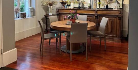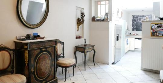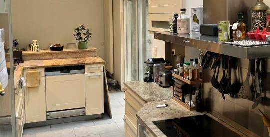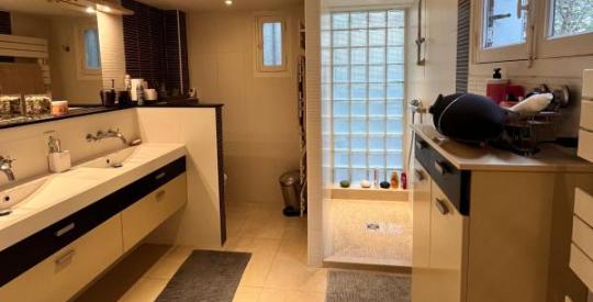Dès l'entrée, le ton est donné : les matériaux d'époque, les hauteurs sous plafond et les perspectives généreuses rappellent l'authenticité et la noblesse des maisons bourgeoises lyonnaises. Le rez-de-chaussée accueille un vaste séjour – salle à manger de plus de 40 m², baigné de lumière naturelle grâce à ses grandes ouvertures donnant sur le jardin. Dans le prolongement, une cuisine familiale indépendante de 17,5 m² invite à la convivialité et à la détente. Un dégagement, des rangements et un WC complètent ce niveau harmonieux. Depuis les pièces de vie, l'accès direct à la terrasse et à la piscine permet de profiter pleinement de la douceur des beaux jours.