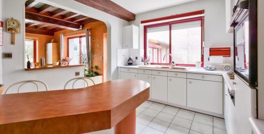 À l'extérieur, vous profiterez d'un agréable jardin agrémenté d'un bassin, d'une grande terrasse abritée, d'une cuisine d'été avec four à pain, idéale pour les beaux jours, ainsi que d'un abri voitures.
