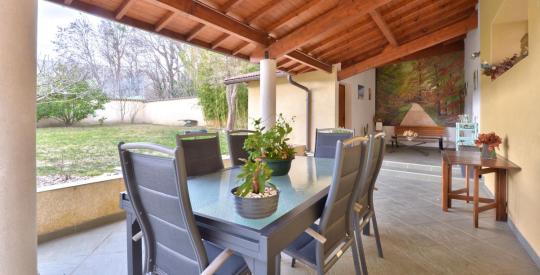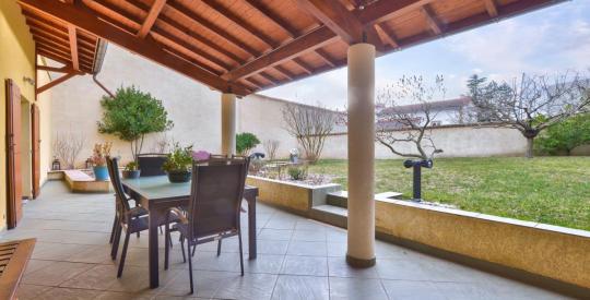 À l'extérieur, vous profiterez d'un agréable jardin agrémenté d'un bassin, d'une grande terrasse abritée, d'une cuisine d'été avec four à pain, idéale pour les beaux jours, ainsi que d'un abri voitures sous le porche de la maison fermé pars un portail automatisé.