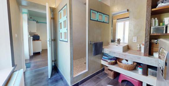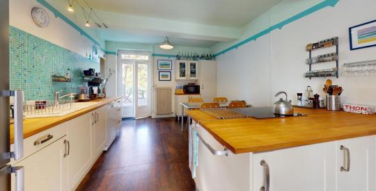 Elle offre un cadre de vie paisible et lumineux, mêlant authenticité et modernité. Le séjour spacieux de 30 m², baigné de lumière, dispose d'une cheminée et s'ouvre sur une grande terrasse exposée sud-ouest. La cuisine indépendante de 23 m², conviviale et fonctionnelle, est parfaite pour les repas en famille.