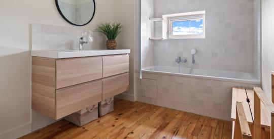 Au rez-de-chaussée : une entrée sur cour, une belle pièce de vie lumineuse de 40 m², une suite parentale avec salle d'eau ouverte sur la terrasse exposée plein sud, une cuisine indépendante, une buanderie et des toilettes invités.