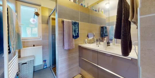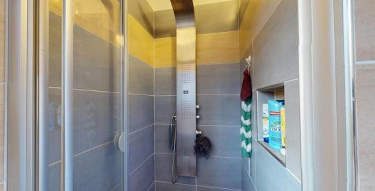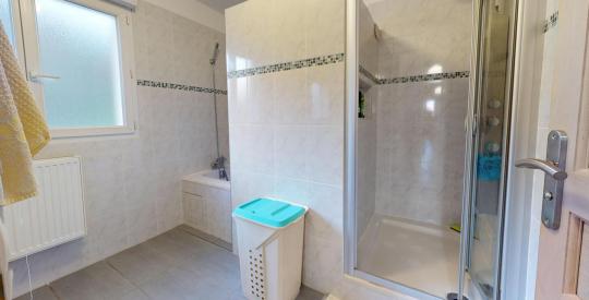 - Une salle de bains moderne, équipée d'une baignoire et d'une douche.