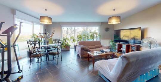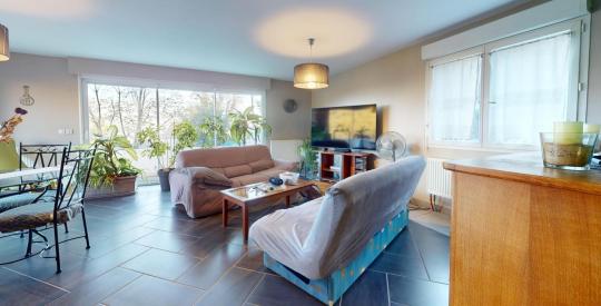 - Un séjour lumineux avec deux grandes baies vitrées, offrant une vue splendide sur le jardin et la colline boisée.
