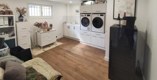 Le rez-de-chaussée propose également une grande buanderie, facilement aménageable en chambre avec salle de douche privative selon vos besoins, un WC indépendant ainsi qu'un accès direct au garage de 22m2.