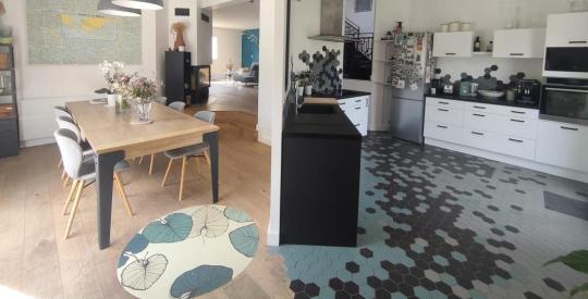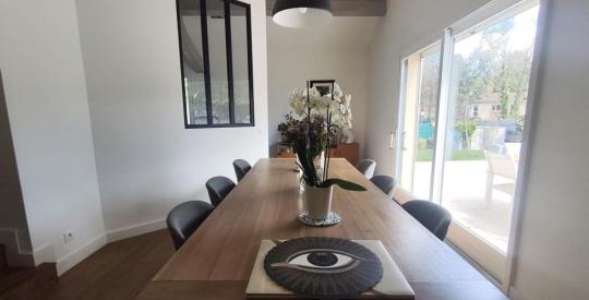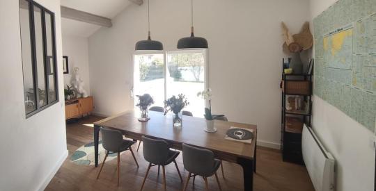 Dès l'entrée, vous serez séduit par une vaste pièce de vie lumineuse, organisée autour d'une cuisine semi-ouverte sur une superbe salle à manger cathédrale et un salon chaleureux, créant un espace convivial et aéré.