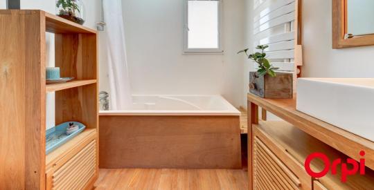 Elle se compose, au rez-de-chaussée, d'une accueillante entrée donnant sur une pièce de vie de 42m² baignée de lumière, d'une cuisine attenante avec son cellier, d'un bureau pouvant faire office de chambre de réception, d'une pièce d'eau avec douche et baignoire et d'un wc indépendant.