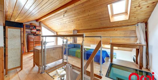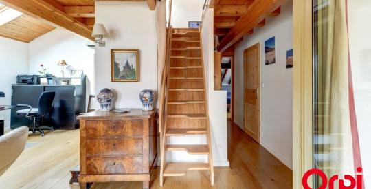 A l'étage de trois chambres, d'un espace salon/bureau avec cheminée, d'une salle de bain lumineuse avec wc et un accès à une mezzanine offrant un espace supplémentaire polyvalent.
