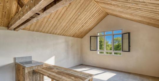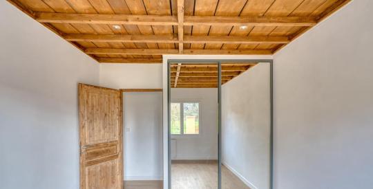 Entièrement rénovée en 2026, la maison a été reprise en totalité : sols, murs, plafonds, réseaux et équipements sont neufs. Les poutres en bois ont été conservées et mises en valeur. Les matériaux choisis — pierre et bois massifs — apportent solidité et caractère.