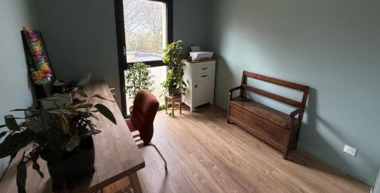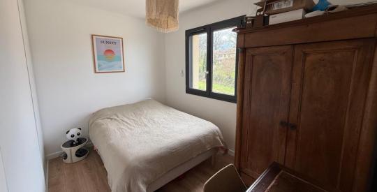 Le rez-de-chaussée accueille une pièce de vie lumineuse avec cuisine ouverte, offrant un espace convivial tourné vers l'extérieur et un accès direct au jardin sans vis-à-vis. Une chambre de plain-pied complète ce niveau.