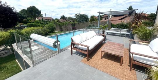 Le jardin paysager exposé Sud/Ouest, parfaitement entretenu, constitue un véritable espace de détente. Il comprend une piscine sécurisée par volet roulant électrique, un potager, ainsi qu'un terrain de pétanque, idéal pour des moments conviviaux en famille ou entre amis.