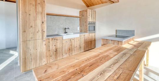 La pièce de vie, spacieuse et lumineuse, accueille une cuisine en bois massif, équipée et ouverte et une large baie vitrée.