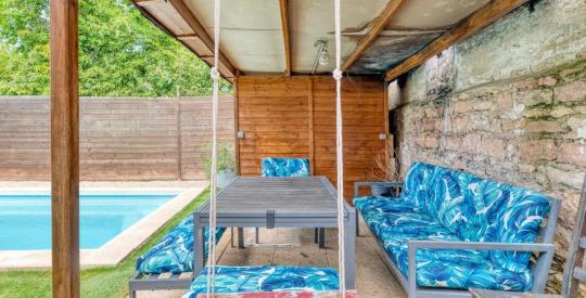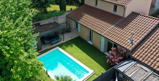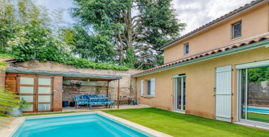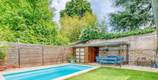 L'extérieur vous séduira à coup sur entre le bleu azur de la piscine et les pierres dorées : Pool house, terrasse et jardin paysager sans vis-à-vis et au milieu d'arbres centenaires.