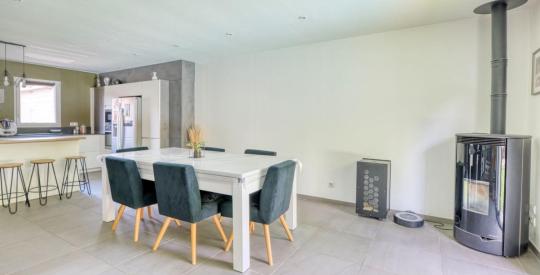 Dotée d'une belle performance énergétique, la maison bénéficie d'équipements de qualité : chauffage au sol, poêle à granulés et panneaux photovoltaïques.