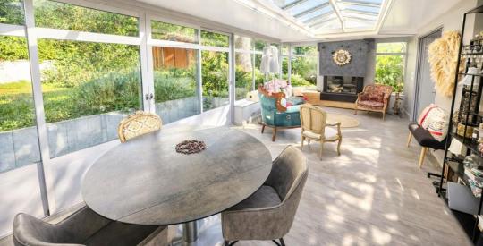 Une véranda de qualité, véritable pièce supplémentaire avec sa cheminée, prolonge agréablement les espaces intérieurs et permet de profiter du jardin tout au long de l'année.