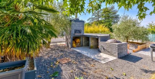 À l'extérieur, vous serez séduits par la grande terrasse aménagée avec coin barbecue, idéale pour recevoir, ainsi qu'un espace ombragé sous les arbres et une seconde terrasse à l'arrière de la maison, parfaite pour les journées d'été.