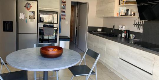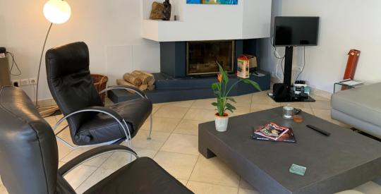 Elle comprend un SAS d'entrée, un wc et une penderie, un superbe séjour de 66 m2 avec son insert, grande porte fenêtre à galandage, une cuisine contemporaine équipée avec un coin cellier/buanderie.