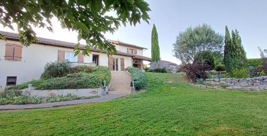Le rez-de-chaussée s'ouvre sur une entrée qui dessert un spacieux séjour . L'espace de vie se prolonge sur une terrasse idéalement orientée avec une très belle vue dégagée sur la piscine et la campagne . La cuisine ouverte, entièrement aménagée et équipée, complète harmonieusement cette première partie de la maison