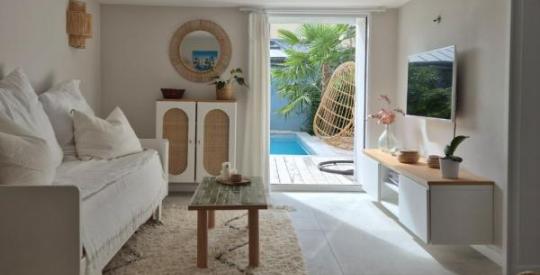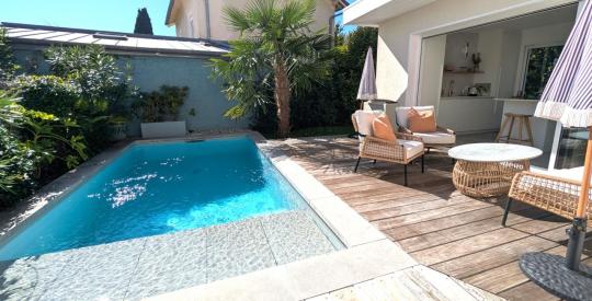 La pièce de vie, baignée de lumière, s'ouvre sur une cuisine élégante et sur l'espace piscine. Le jardin intime et clos, aménagé autour de la piscine avec volet de sécurité, promet d'agréables moments de détente en toute discrétion.
