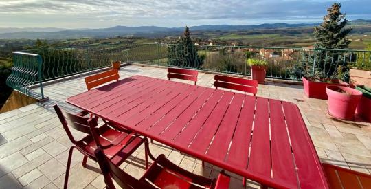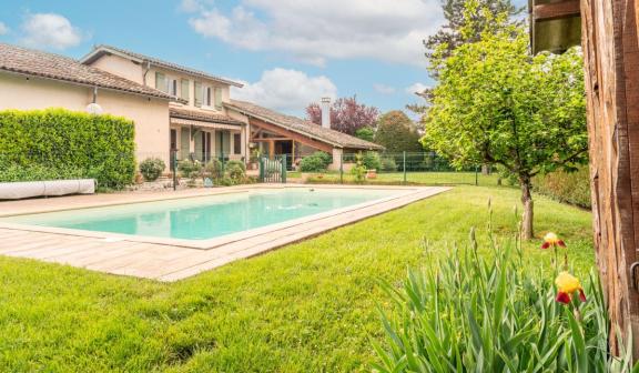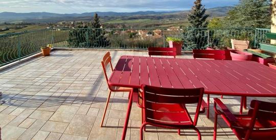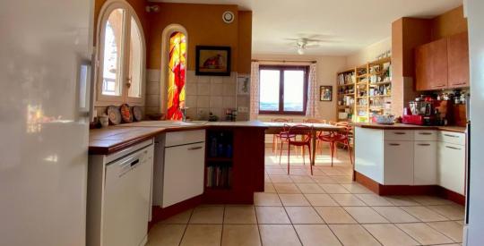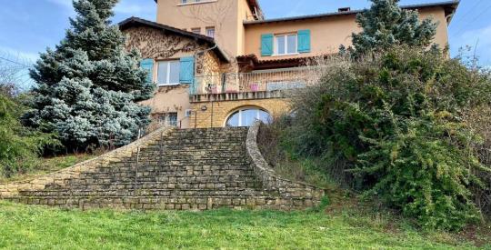 Aux portes du Beaujolais, dans le village médiéval en pierre dorée du Bois d'Oingt, sur un beau terrain de 2415m2 piscinable, , nous vous proposons une vaste demeure de 410m2 habitable et ses annexes, sur 3 niveaux, avec un appartement indépendant de deux chambres au rez-de-chaussée accès PMR.