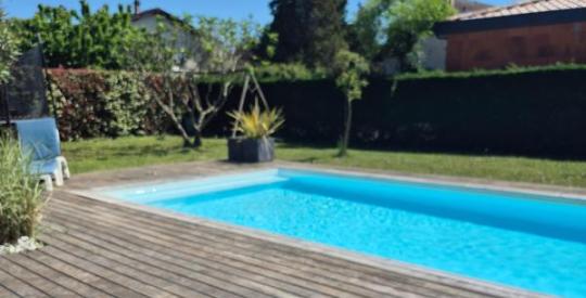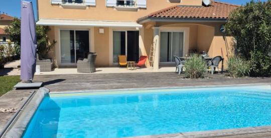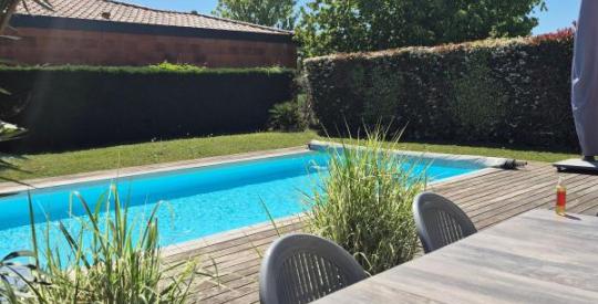 La maison est édifiée sur un terrain de 850 m2 clos de murs et paysagé et dispose d' une agréable piscine .