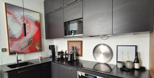 L'appartement principal se compose d'une grande et élégante entrée faisant office de bibliothèque, d'un dressing, de 3 immenses pièces de réception, d'une cuisine contemporaine vendue toute équipée, d'une chambre, d'une salle de douche, d'une salle de bain, et de 3 WC.