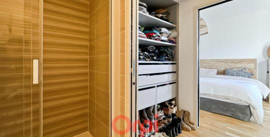 Au niveau du séjour, une suite parentale avec parquet chêne, dressing et salle d'eau contemporaine.