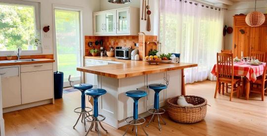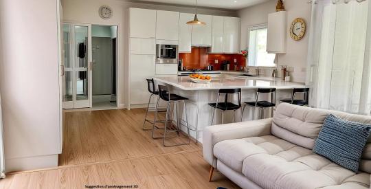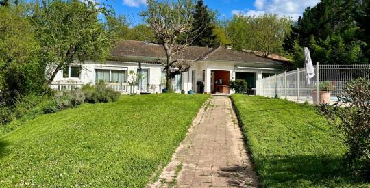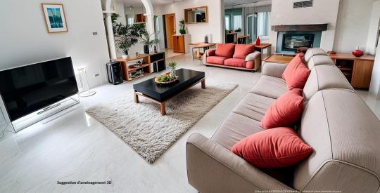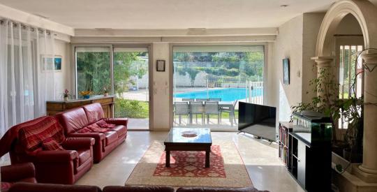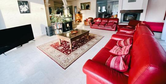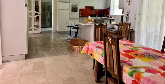 Construite en 1980, elle vous offre une majestueuse pièce de vie de 100 m2 avec sol en marbre, généreuses ouvertures donnant sur le jardin qui entoure la maison et cheminée à insert, avec une partie cuisine ouverte sur la salle à manger, et une buanderie.