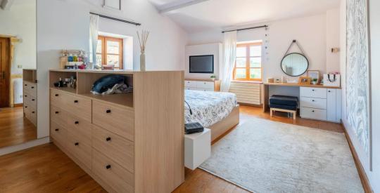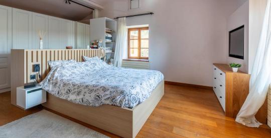 À l'étage, une coursive distribue plusieurs chambres spacieuses à l'ambiance douce et reposante, où les poutres apparentes et les parquets massifs créent une harmonie parfaite. Chaque pièce invite au calme et à la détente, idéale pour accueillir famille et invités dans un cadre chaleureux et préservé.